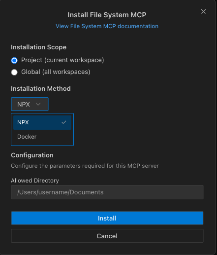 • Select an installation method (NPX or Docker)